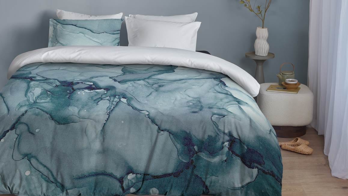 Ben jij een liefhebber van grafische prints? Dan is het Rhea dekbedovertrek echt iets voor jou! Het grafische ontwerp bestaat uit verschillende blauwtinten en voegt eenvoudig kleur toe aan jouw interieur. De achterzijde is effen wit.