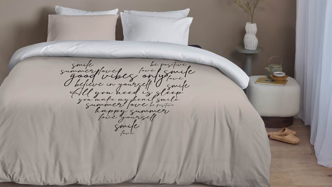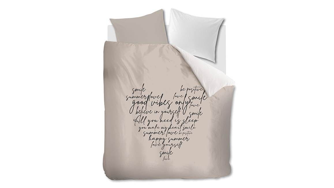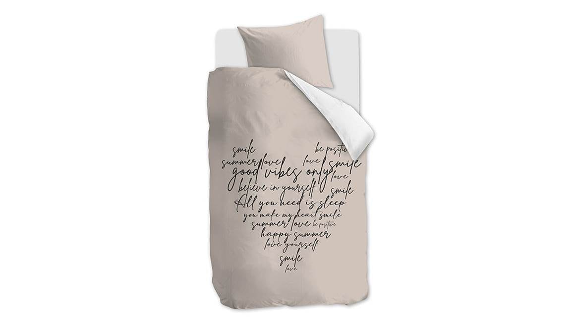 Begin iedere dag goed met het Blushwood Love Yourself dekbedovertrek. Op het zandkleurige overtrek staan er verschillende teksten die jouw zelfvertrouwen iedere dag een boost geven. De teksten vormen samen een groot hart. Met de witte achterzijde maak je een luxe omslag.