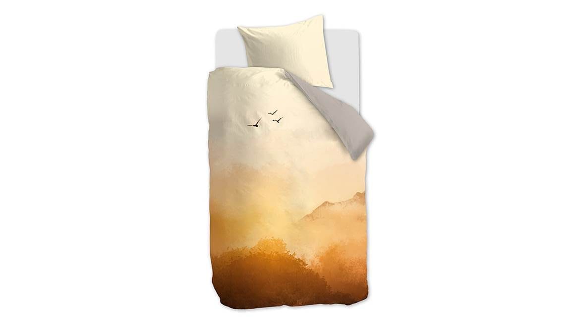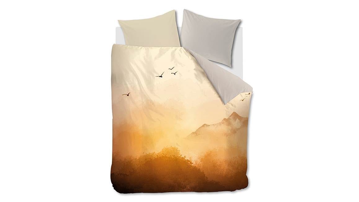 Haal het zomerse vakantiegevoel in huis met het Blushwood Tecla dekbedovertrek. De print is een geschilderd berglandschap die dankzij de ondergaande zon uit verschillende tinten oranje ontstaan. In de lucht vliegen enkele vogels. Zo val je iedere avond echt ontspannen in slaap!