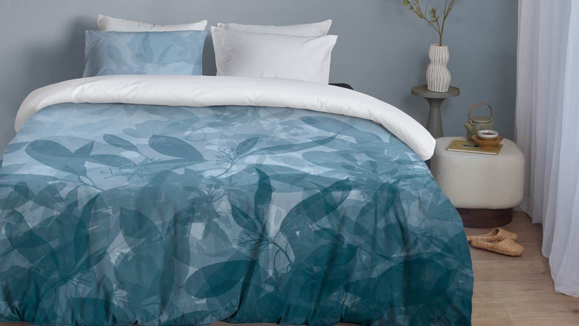 Droom iedere avond heerlijk weg onder het Blushwood Tys dekbedovertrek. Het blauwe dessin bevat een bladerprint in diverse blauwtinten. Met de effen witte achterzijde maak je een luxe omslag. De bijbehorende kussenslopen bevatten beide prints, zodat je eindeloos kunt combineren.