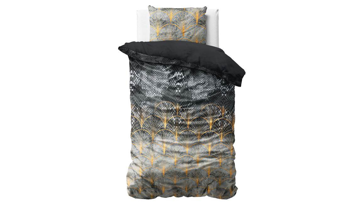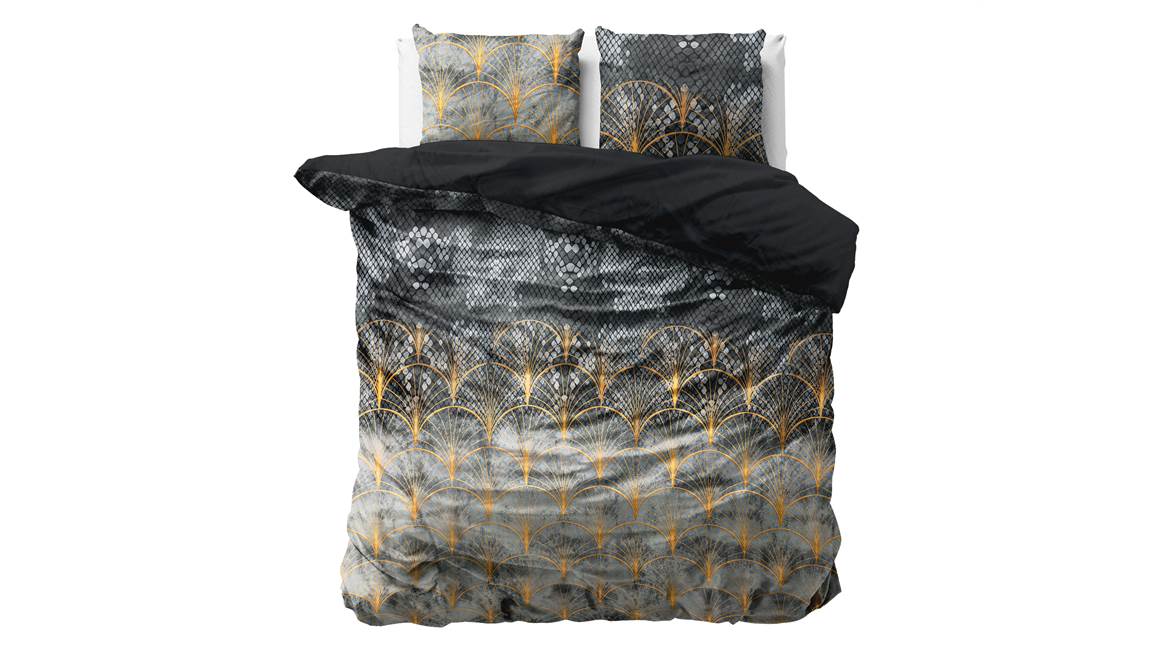 Het Fluweel Mente dekbedovertrek brengt de Art Deco-stijl naar jouw slaapkamer dankzij de gouden geometrische vormen. De vormen bevinden zich op een schubben en velvet look. Deze combinatie tovert op je slaapkamer een moderne sfeer.