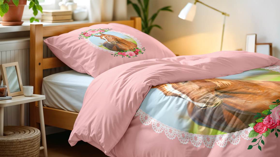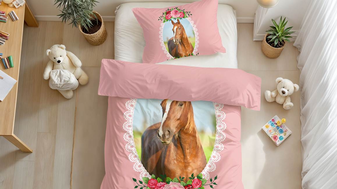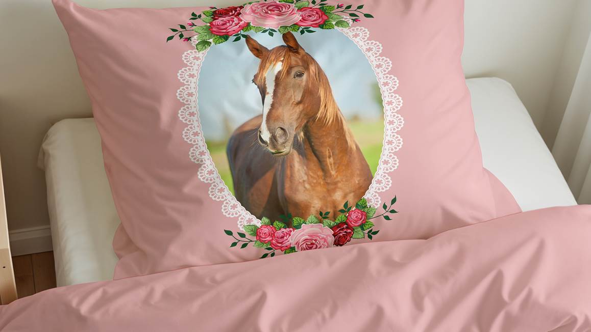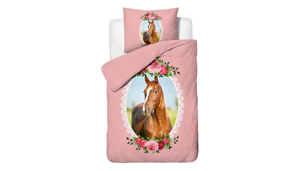 Zijn paarden jouw lievelingsdier? Dan is het Little Monster Cute Horse dekbedovertrek écht iets voor jou! Op het roze overtrek staat een mooi bruin paard in een soort fotolijst. Aan de boven en onderkant zijn rode en roze bloemen afgebeeld.