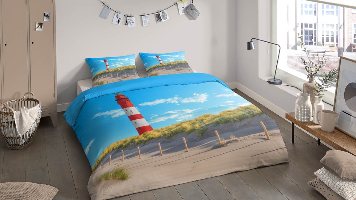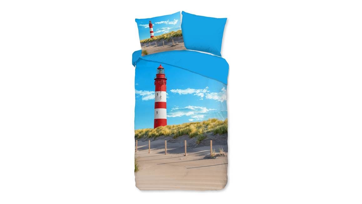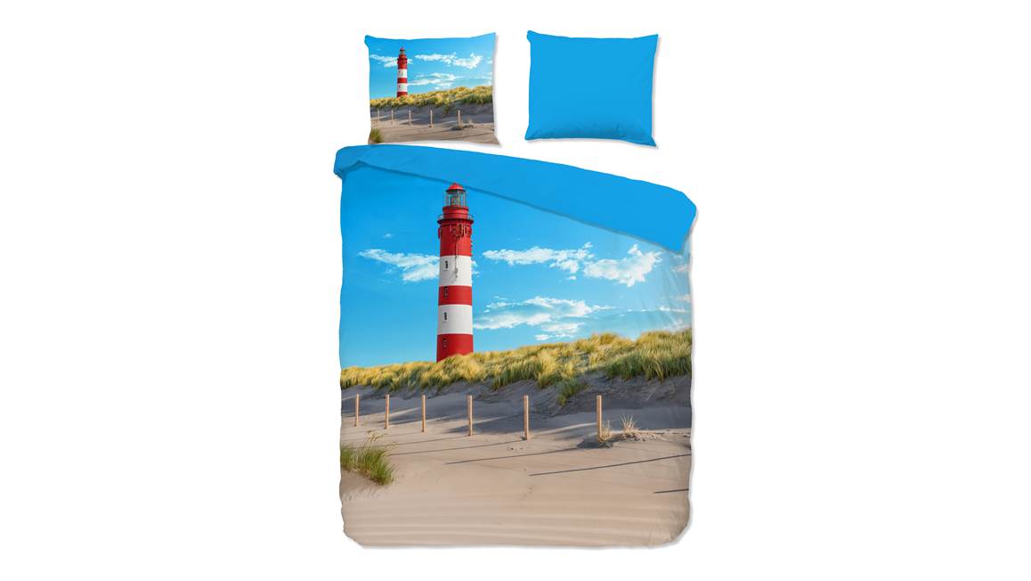Met het Pure Beach dekbedovertrek kun je haast de zee al ruiken. Met het overtrek is het net alsof je op het strand staat en kijkt naar de duinen waar een grote vuurtoren te zien is. De achterzijde heeft dezelfde blauwe kleur als de lucht.