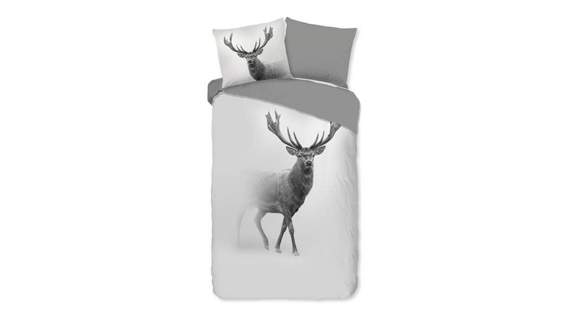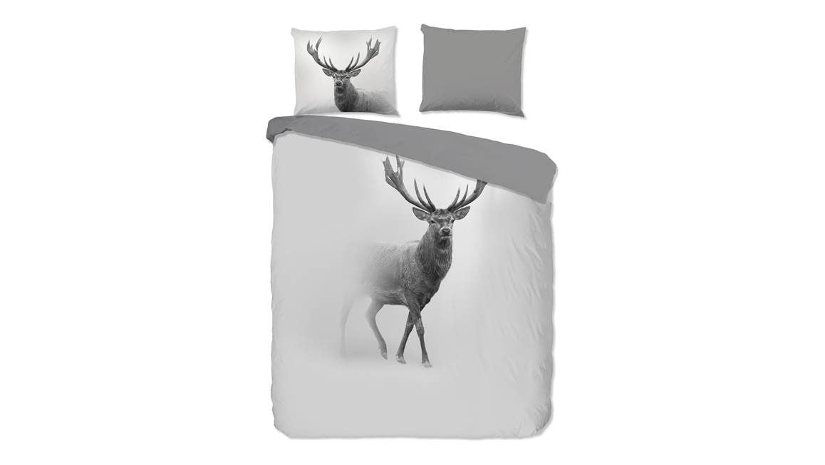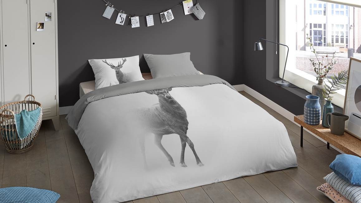 Het grijze hert op het Pure Grey Deer dekbedovertrek is een ware eyecatcher. De print in verschillende grijstinten straalt rust uit. Door de realistische print lijkt het net alsof het hert uit de mist zo het overtrek op komt lopen.