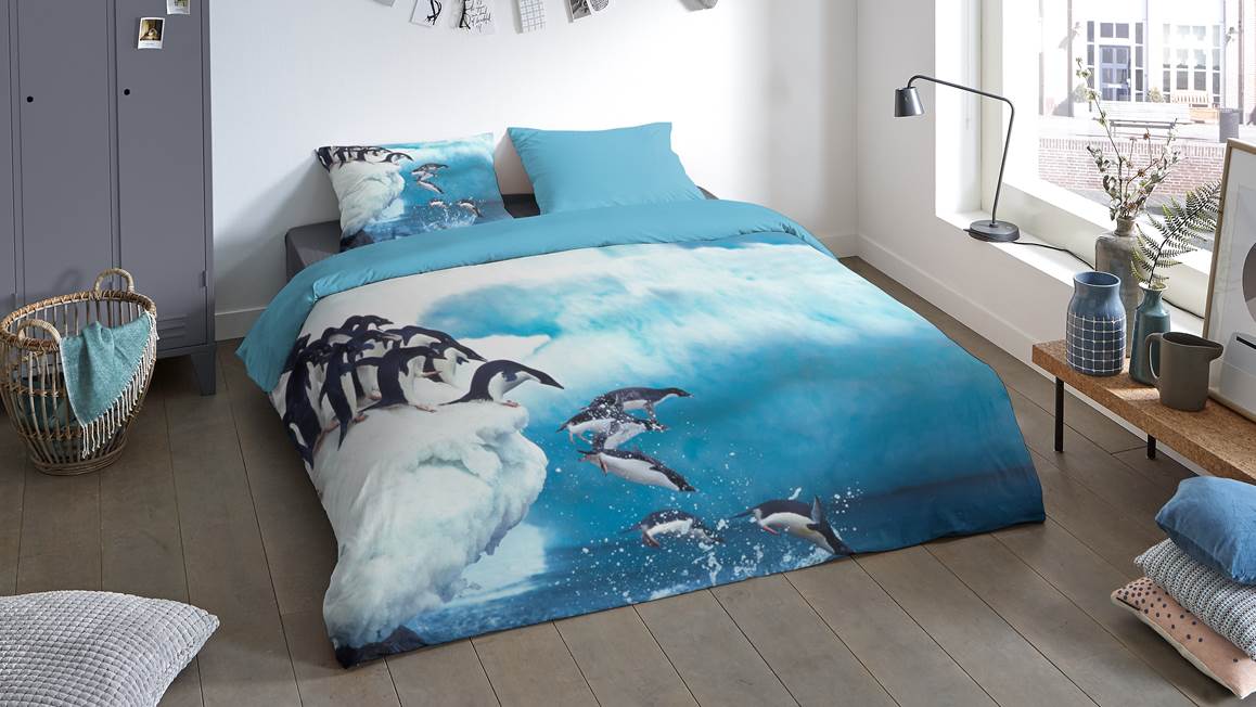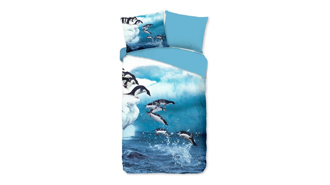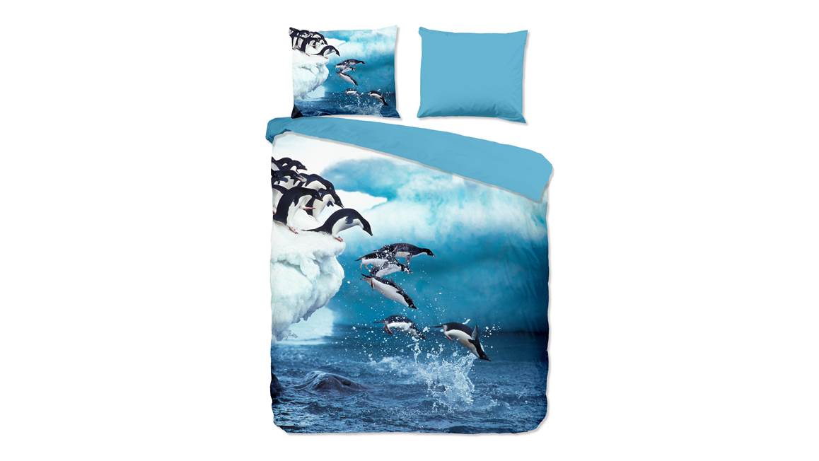 Met het Jump dekbedovertrek is het net alsof je zelf langs de oceaan staat. Het blauwe dessin bevat een print van pinguïns die achter elkaar de oceaan inspringen vanaf de ijsberg. Met het detail van spetterend water kom je echt tot rust.