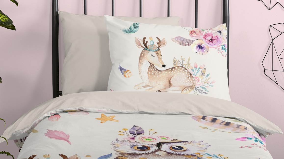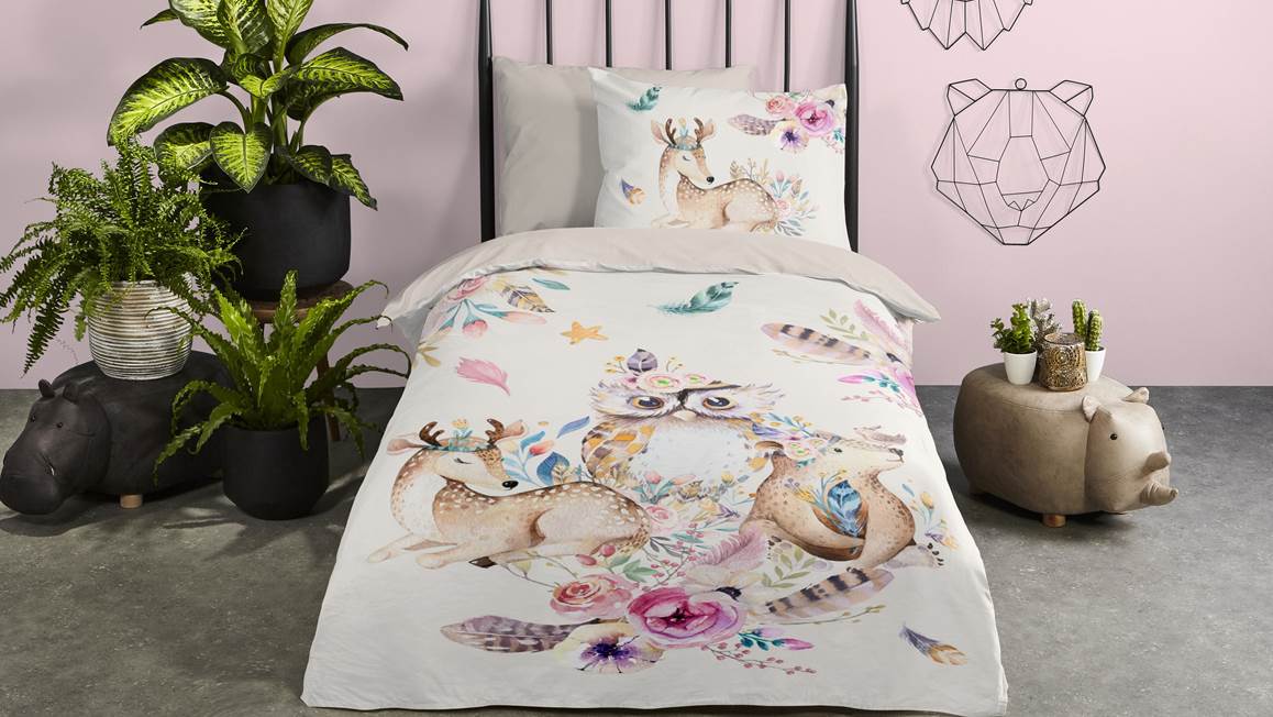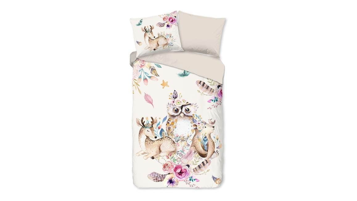 Creëer rust in je slaapkamer met het Meandra dekbedovertrek. De print van de verschillende bosdieren, kleurrijke bloemen en veren komen mooi naar voren op het gebroken wit. De vrolijke tooien maken van het overtrek een lief plaatje.