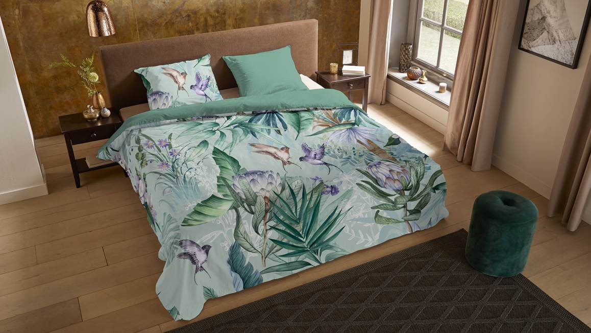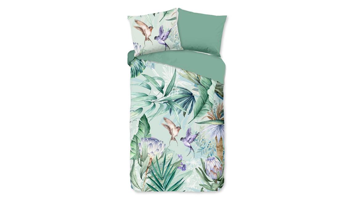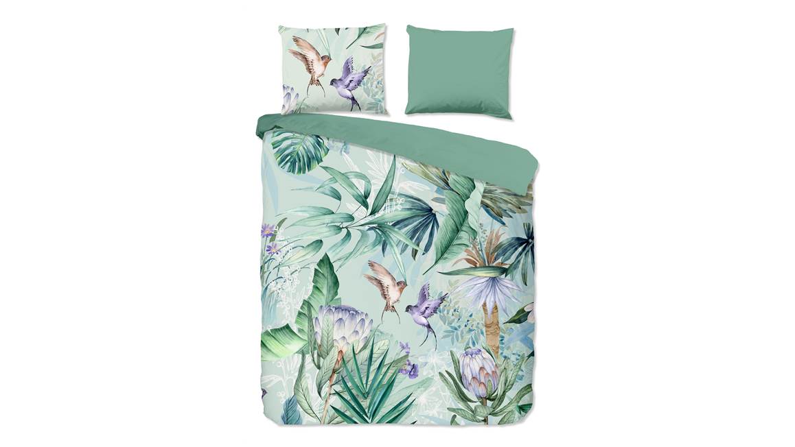 Breng het voorjaar naar jouw slaapkamer met het Saba dekbedovertrek. Het fleurige dessin bestaat uit een groene print vol bladeren, bloemen en vogels. Dankzij de bijpassende kleuren krijgt het overtrek een vrolijke look.