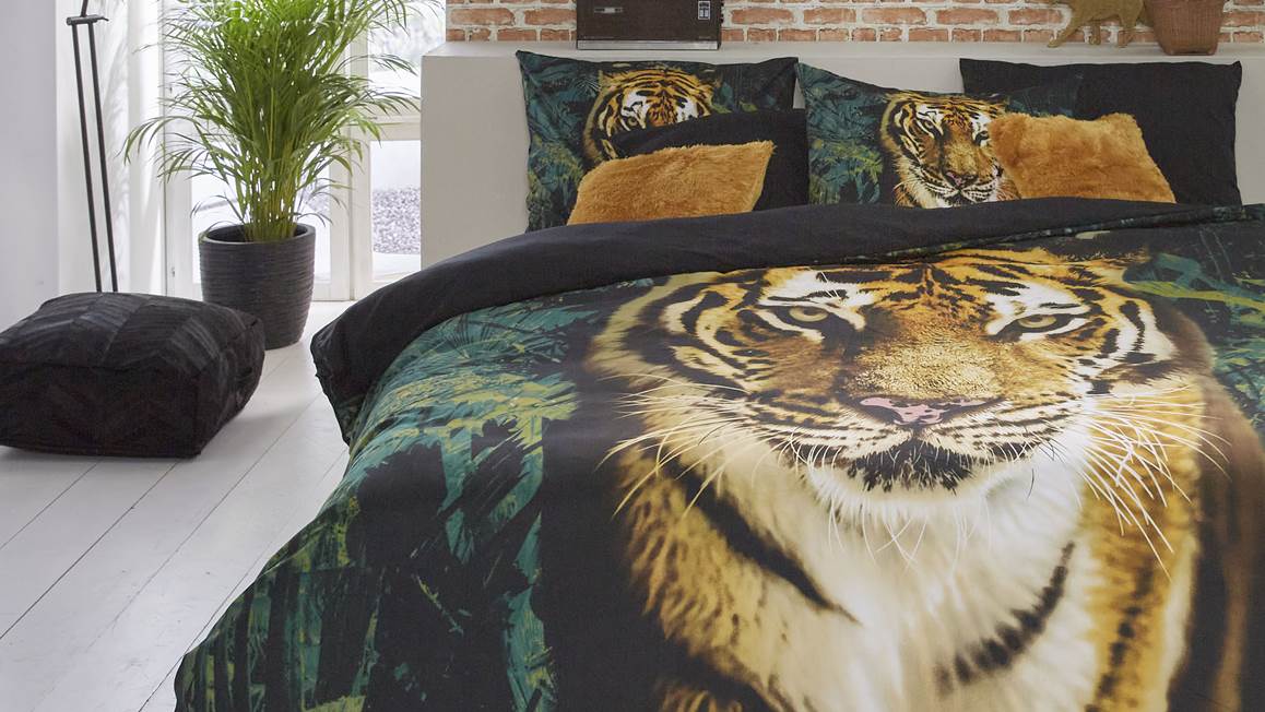 Creëer een stoere uitstraling in jouw slaapkamer met het Tiger dekbedovertrek. De grote tijger is de eyecatcher van het overtrek. Het wilde dier komt prachtig uit dankzij de donkergroene ondergrond. De achterzijde is effen zwart van kleur.