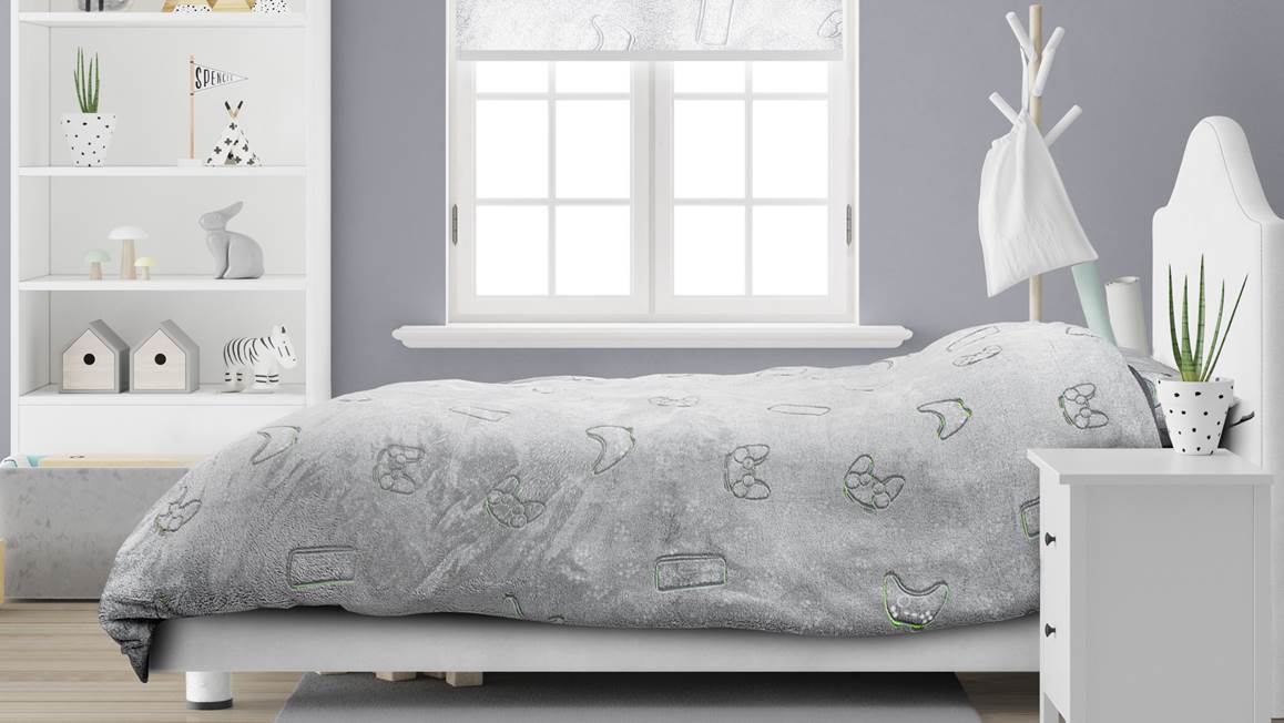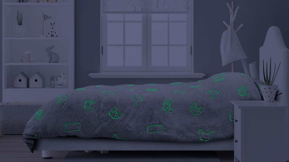Het Glow in the dark Games dekbedovertrek is een echte must-have voor de kleine gamer! Deze grijze print bevat allerlei leuke game-items. En wordt het donker in je slaapkamer, dan ontstaat er een stoer glow in the dark effect.