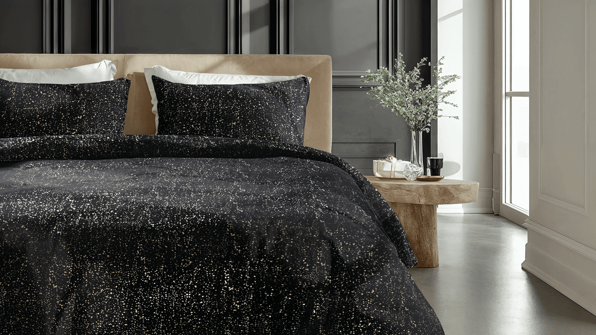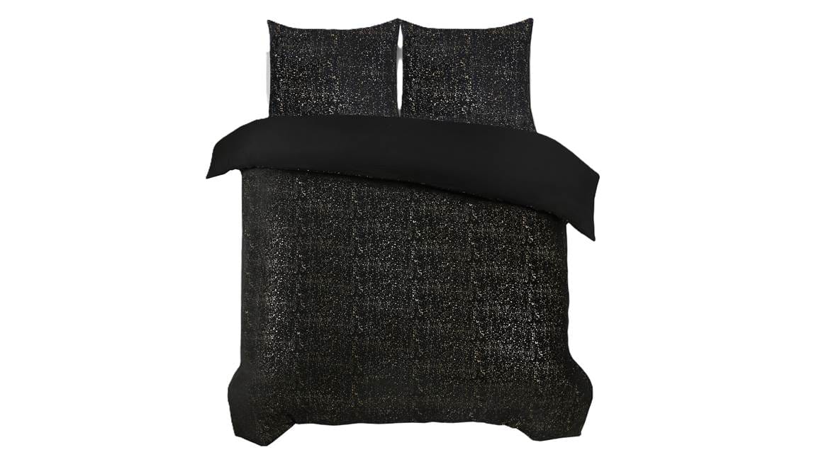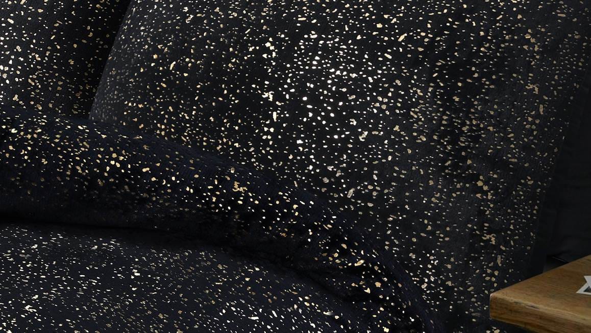 Voor een luxe, chique uitstraling in je slaapkamer kies je voor het Sleeptime Sparkle flanel dekbedovertrek. Een prachtig overtrek in een zwarte kleur met een mooie goudfolie print. De print zorgt voor ultieme luxe. Het dekbedovertrek is gemaakt van een heerlijk zacht en warm materiaal, bij uitstek geschikt voor de koudere winternachten. Droom heerlijk weg onder het Sparkle dekbedovertrek!