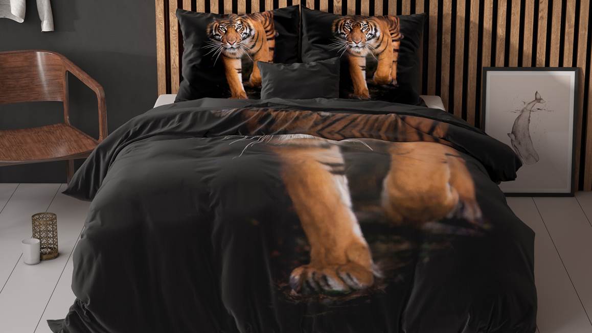 Een prachtige tijger sluipt naar je toe op het Sleeptime Tiger Icon dekbedovertrek. Het wilde dier komt fantastisch uit op de zwarte ondergrond wat de print een mysterieuze touch geeft. De bijbehorende kussenslopen zijn voorzien van dezelfde print voor een stijlvol geheel.