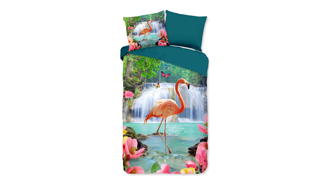 Ben jij een dierenliefhebber? Dan kan het Pure Flamingo dekbedovertrek niet ontbreken in je slaapkamer. De prachtige roze flamingo staat heerlijk in het water. Op de achtergrond zie je een waterval en op de voorgrond meerdere roze bloemen.
