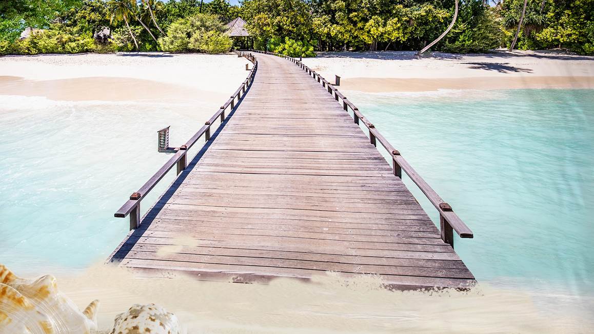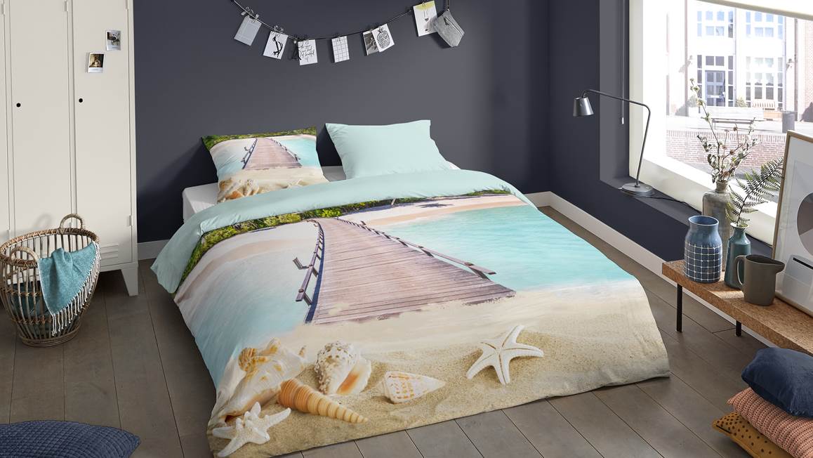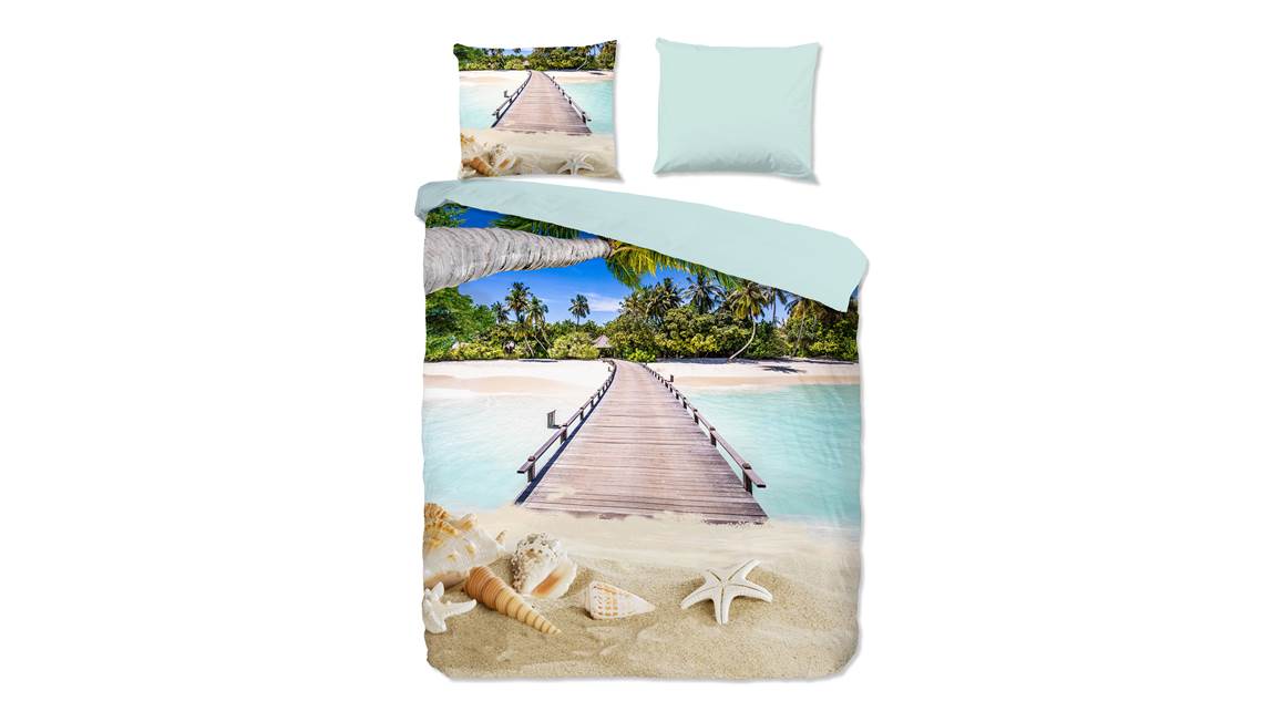 Met het Pure Moana dekbedovertrek is het net alsof je zelf met je voeten in het zand staat. De houtenbrug leidt je van het ene strand, over het heldere blauwe water, naar het strand aan de overkant. Droom iedere nacht weer heerlijk weg.