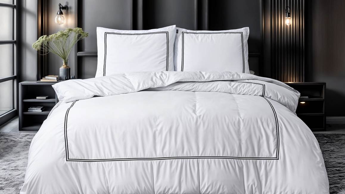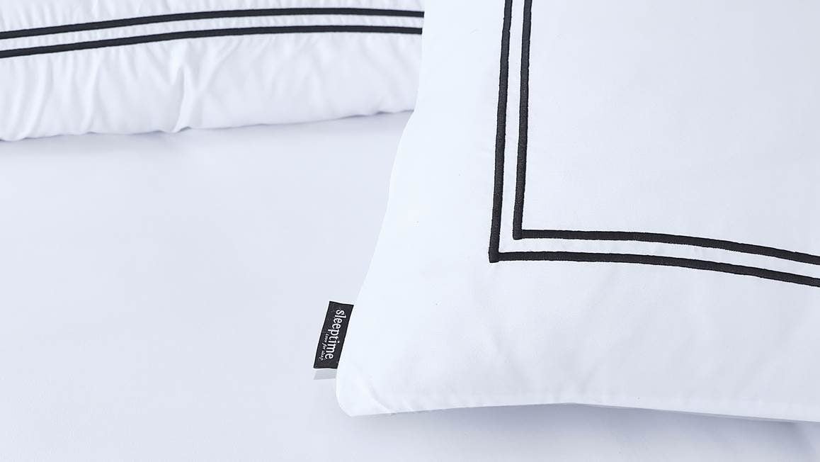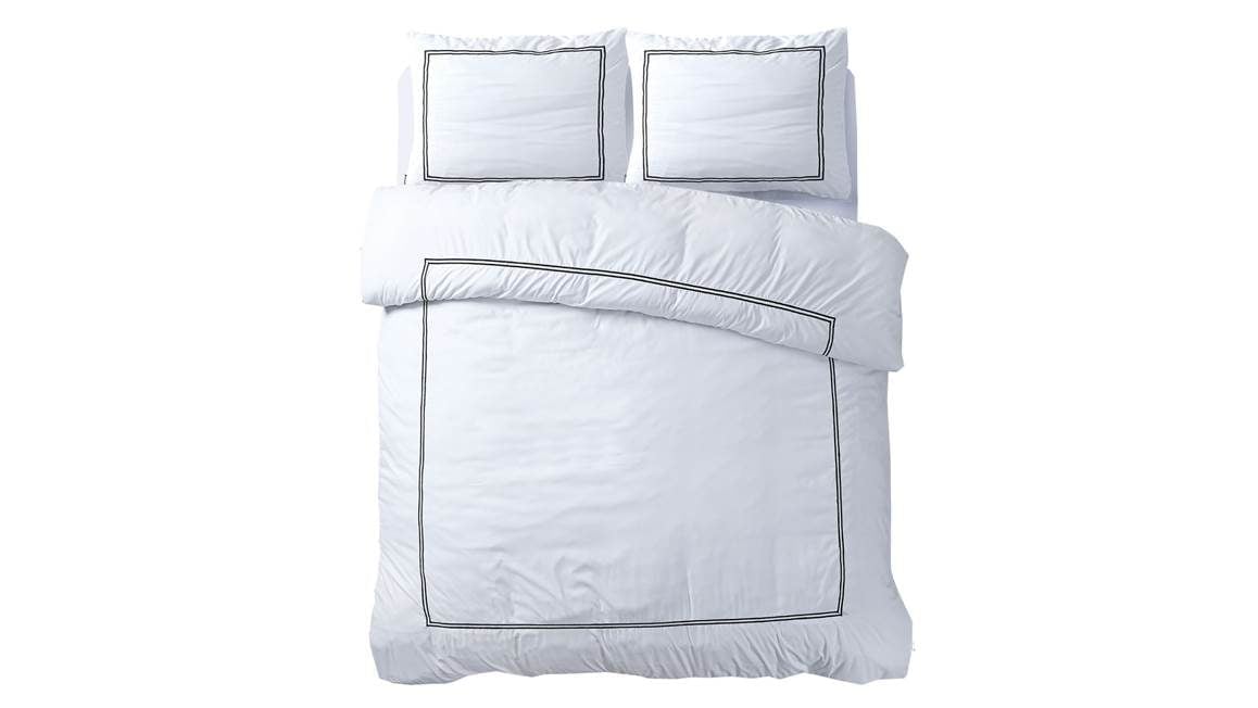 Geef jouw slaapkamer een chique uitstraling met het Sleeptime Brata dekbedovertrek. Op het witte overtrek vormen twee zwarte lijnen een stijlvol vierkant. De bijbehorende kussenslopen bevatten dezelfde omlijning als print.