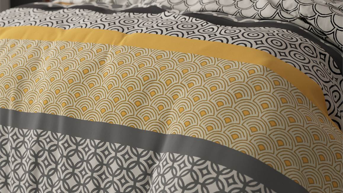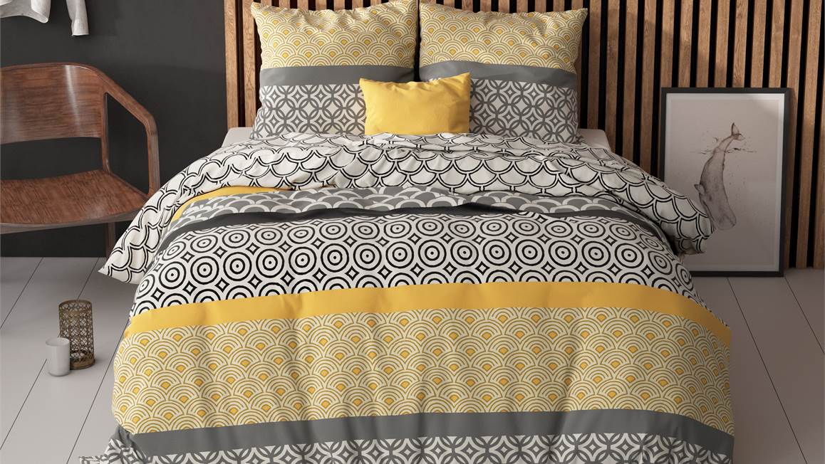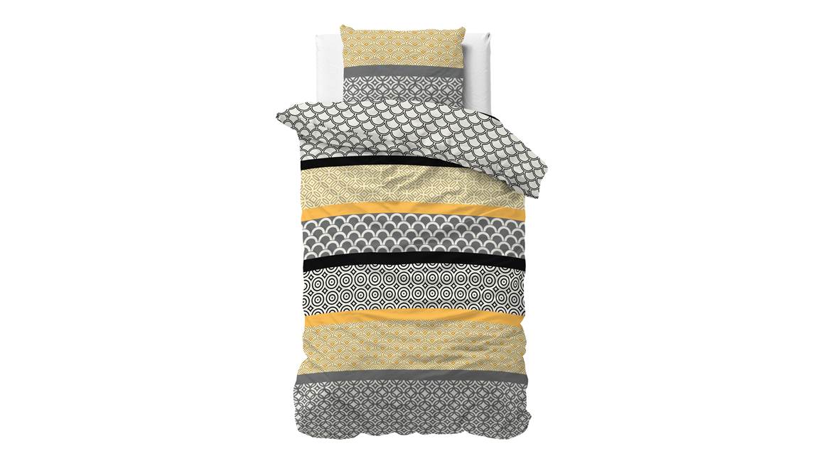 De verschillende grafische prints van het Chezka dekbedovertrek zorgen voor een speelse, maar tegelijkertijd tijdloze uitstraling. Daarnaast past het kleurenpalet van grijs, zwart en geel uitstekend in een modern slaapkamerinterieur.