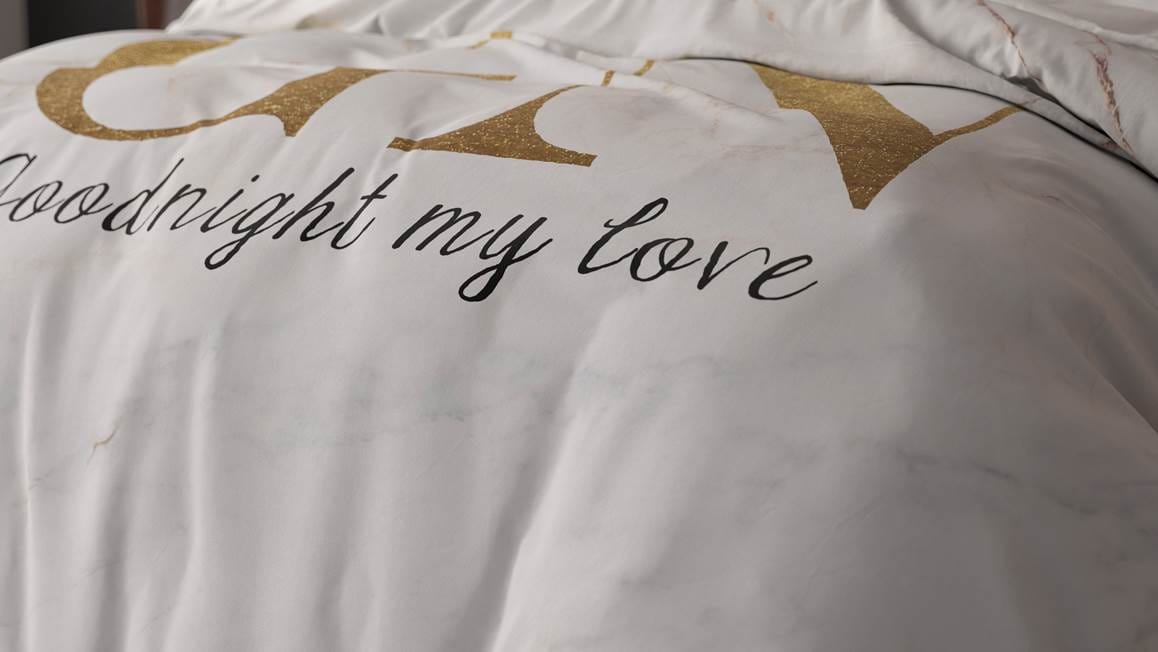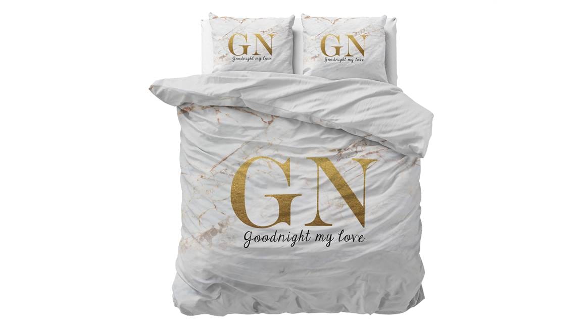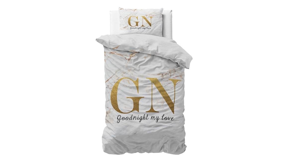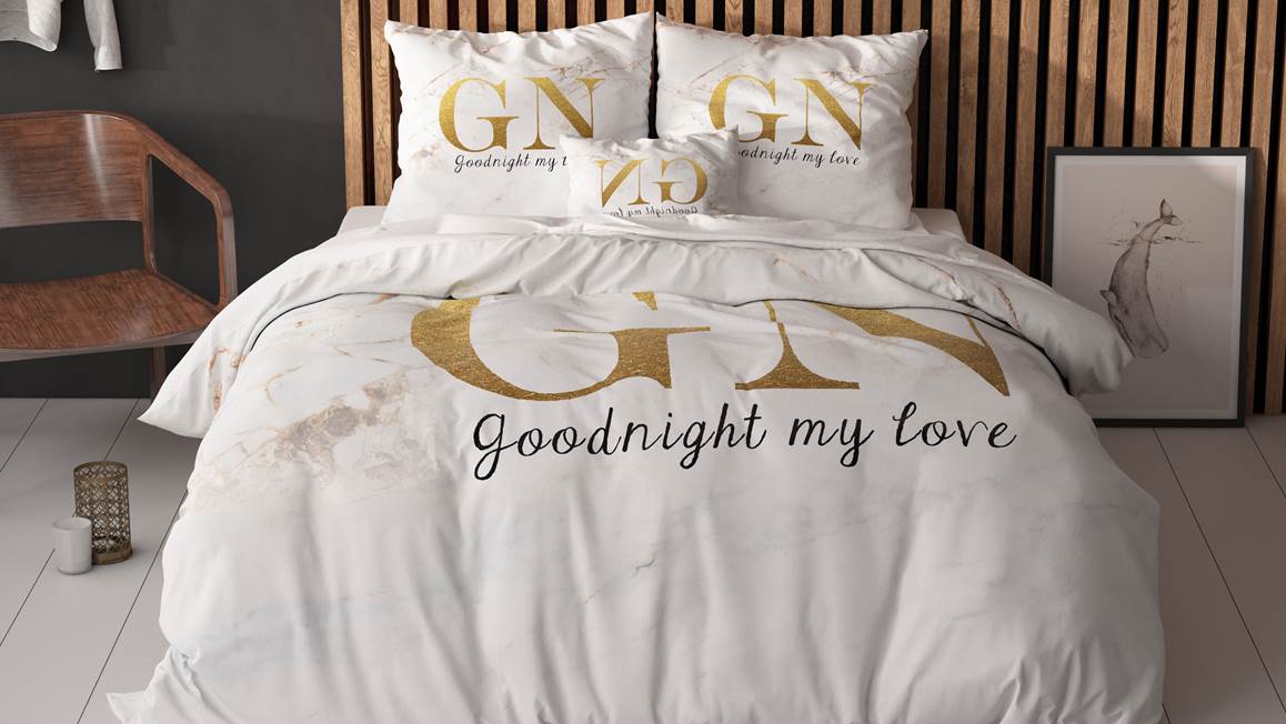 Geniet iedere nacht van een heerlijke nachtrust met het Sleeptime Goodnight dekbedovertrek. De gouden letters laten het ontwerp erg chique ogen en daaronder staat de tekst “Goodnight my love”. De ondergrond heeft een gouden marmeren accent. Met de effen achterzijde creëer je eenvoudig een luxueuze omslag.