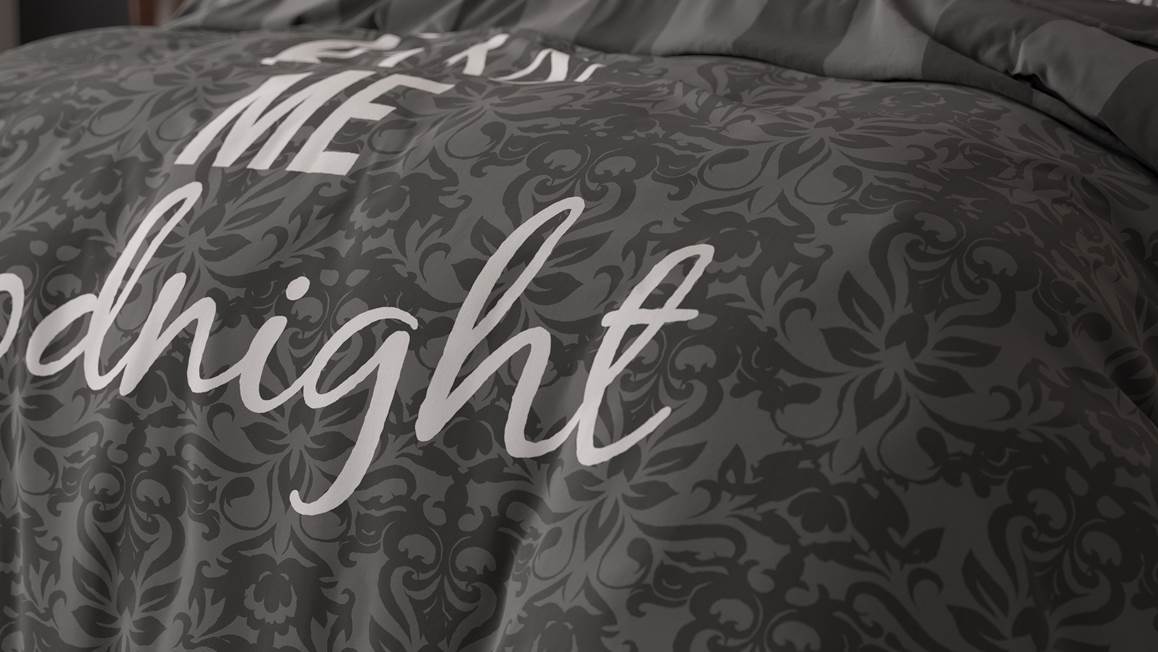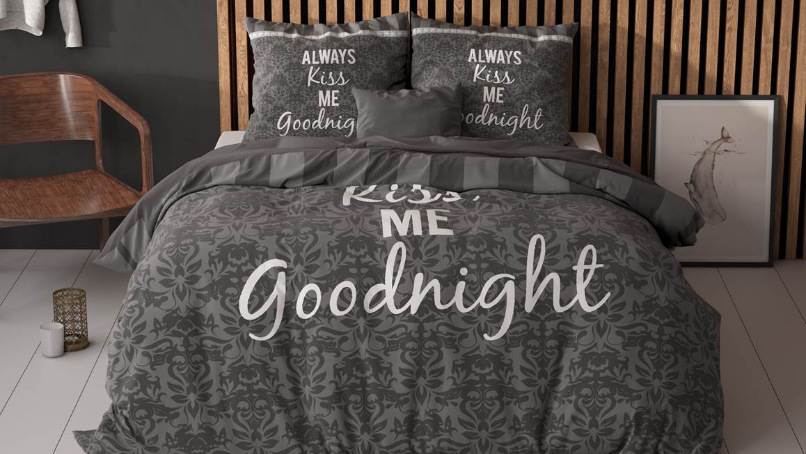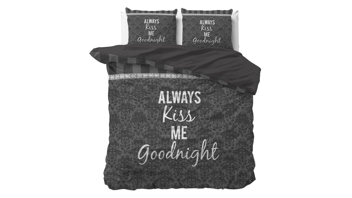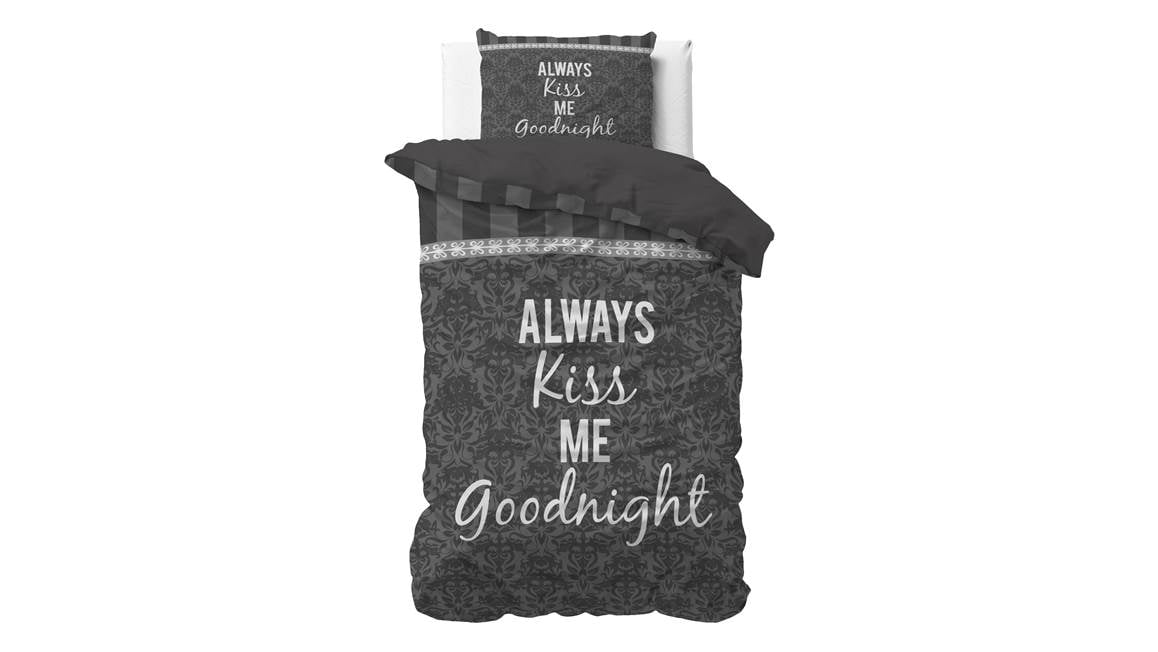 Het Kiss Your Love dekbedovertrek heeft een romantische uitstraling. Op het grijze dessin zie je een leuk patroon van ornamenten. De tekst ‘Always kiss me goodnight’ maakt het plaatje helemaal af!