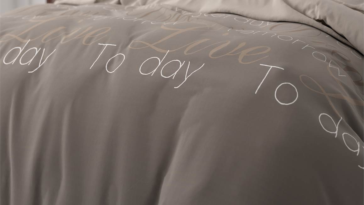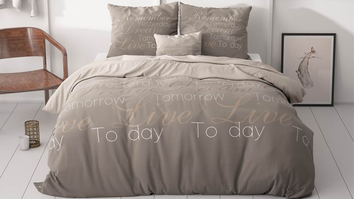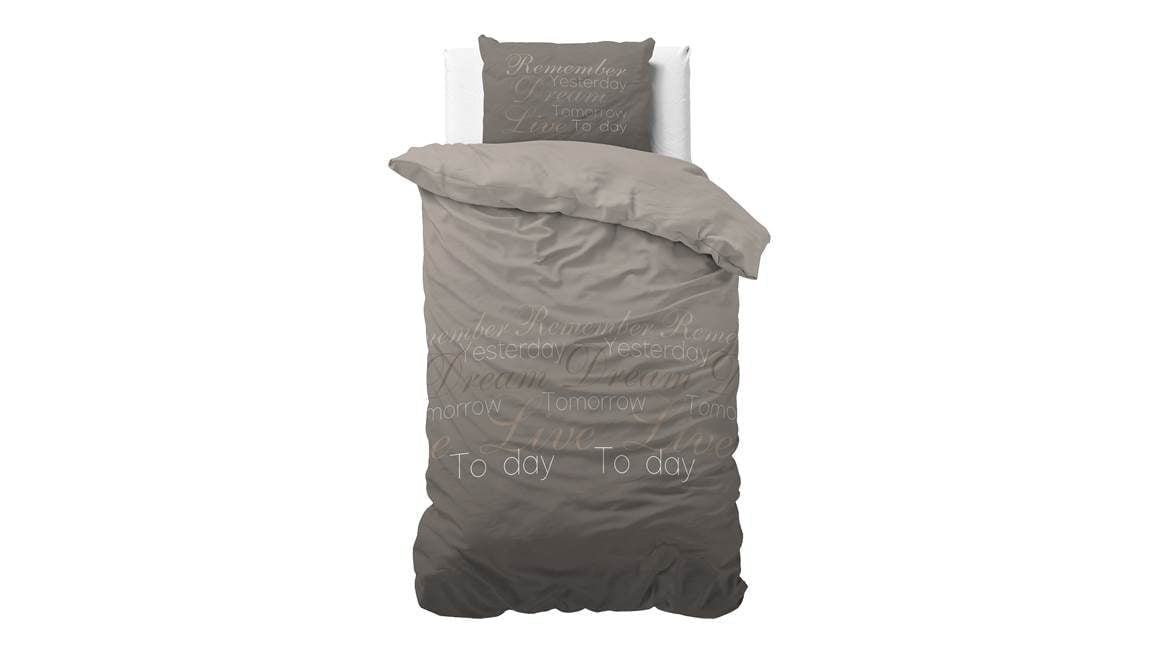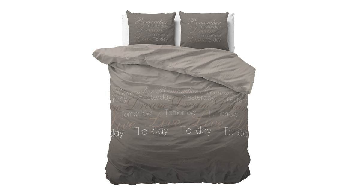 Laat je inspireren door het Sleeptime Live Today dekbedovertrek. Dit taupekleurige overtrek is bedrukt met de inspirerende tekst: “Remember yesterday. Dream tomorrow. Live today.” Een prachtige herinnering om de dag mee te starten!