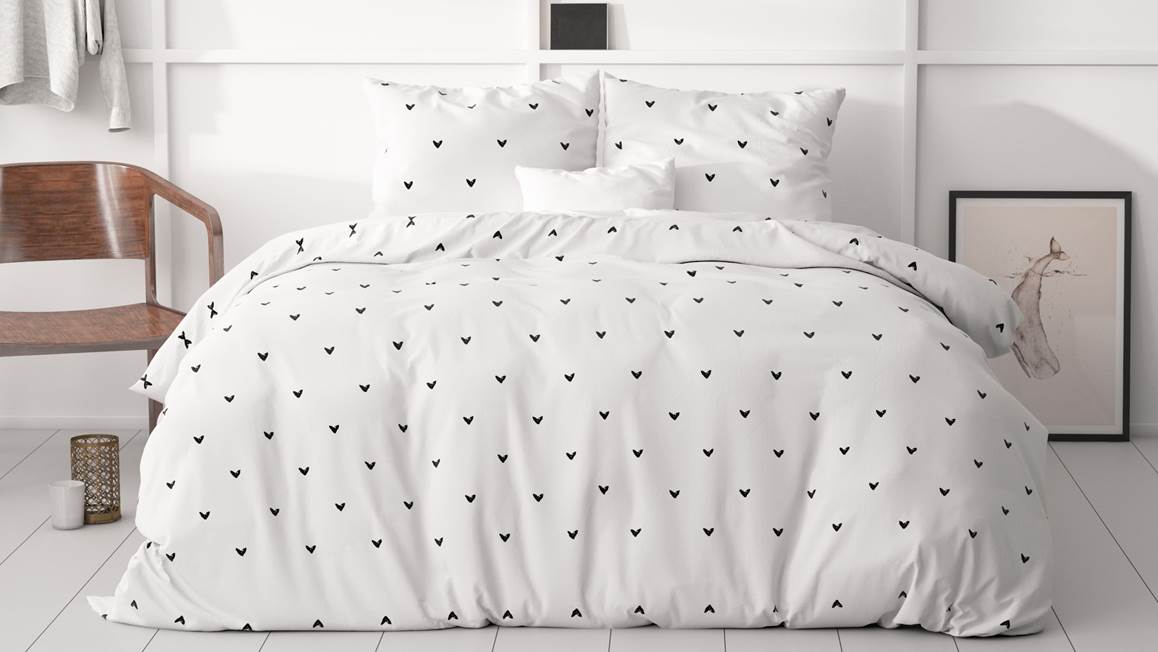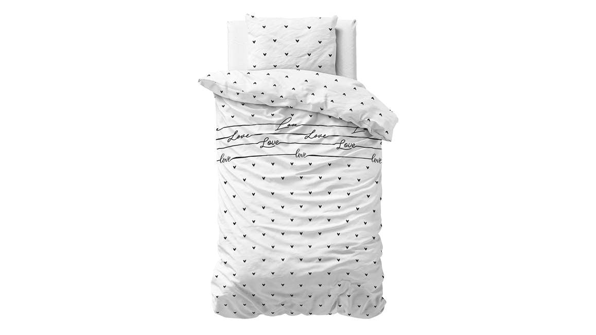 Val iedere avond als een roosje in slaap onder het Sleeptime Love on Love dekbedovertrek. Het witte dessin is voorzien van allemaal kleine zwarte hartjes en op de bovenste helft staat de tekst “Love” meerdere keren geschreven. Zo geniet je altijd van liefdevolle avonden.