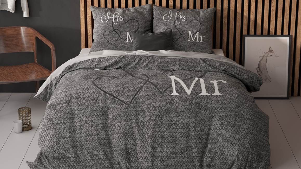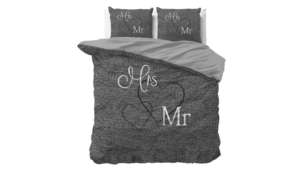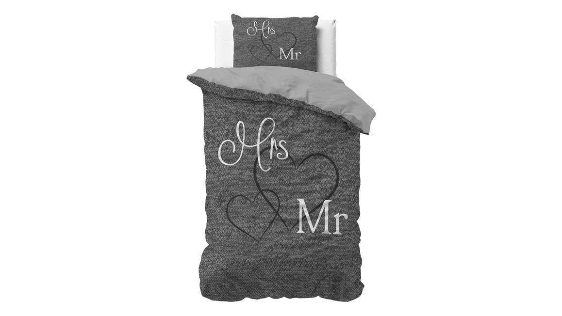 Met het leuke Mr and Mrs dekbedovertrek geef je de slaapkamer een romantisch tintje! De stijlvolle print bestaat uit een knus breipatroon met daarop sierlijke harten. Om het plaatje af te maken komen de letters ook terug op de kussenslopen.