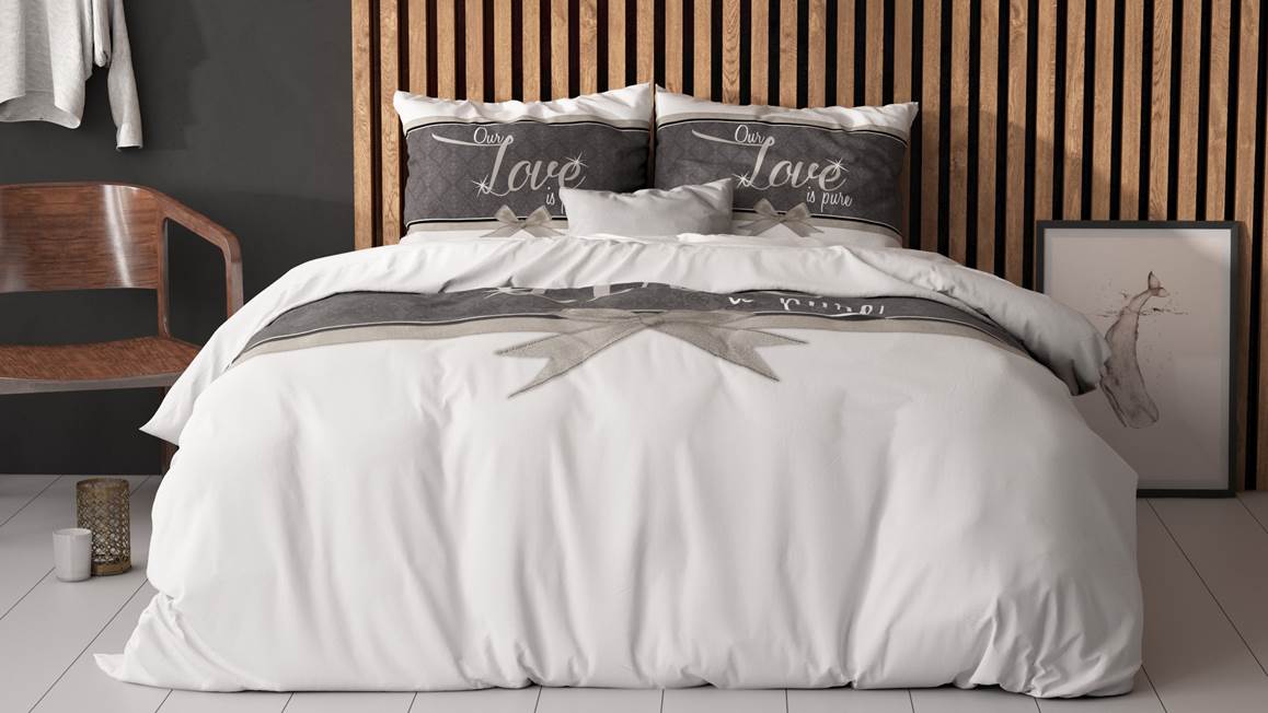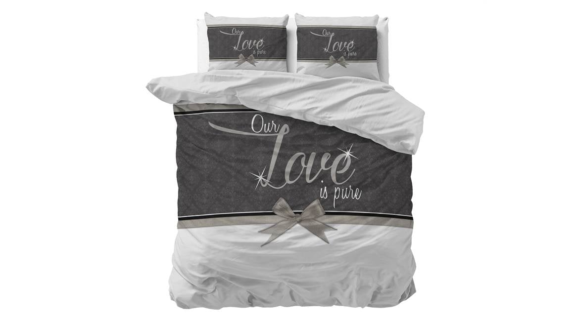 Geef jouw slaapkamer een frisse uitstraling met het Sleeptime Pure Love dekbedovertrek. Het wit met grijze overtrek bevat de tekst “Pure Love” en is afgewerkt met een prachtige strik. Ook komt de print terug op de bijbehorende kussenslopen, zodat er een mooi geheel ontstaat.