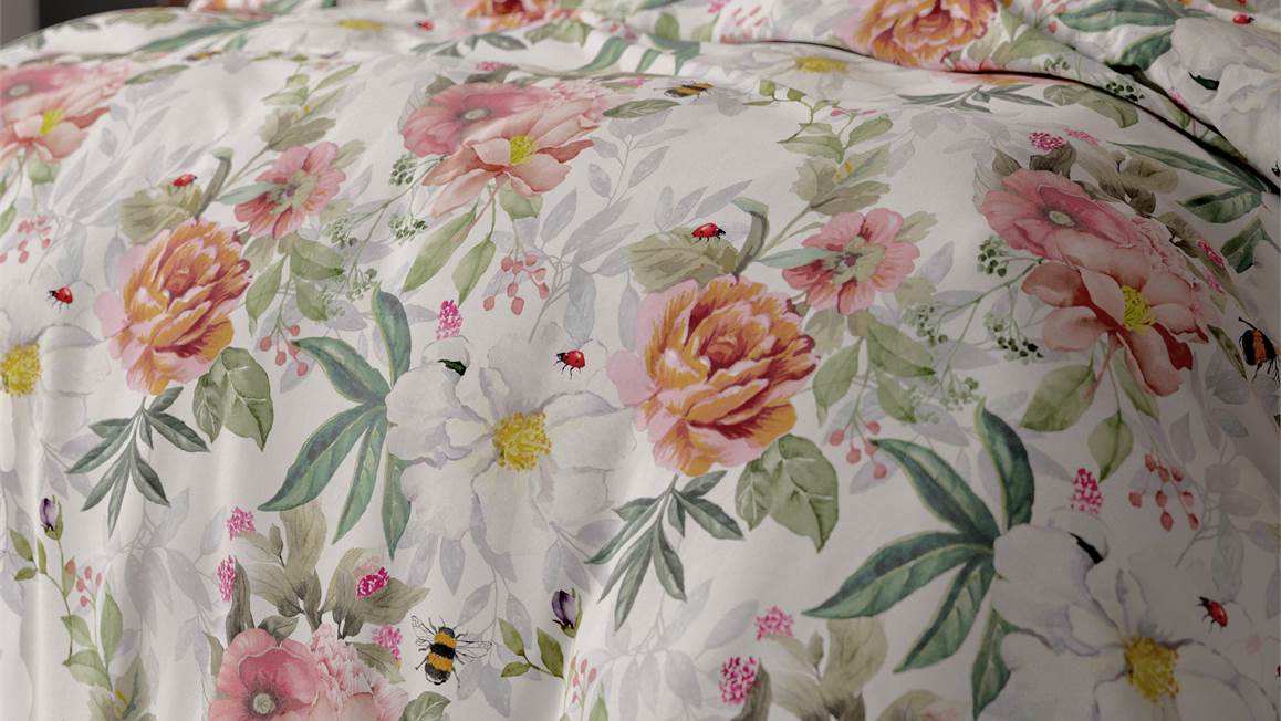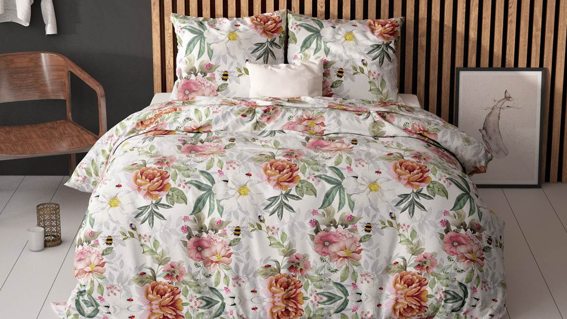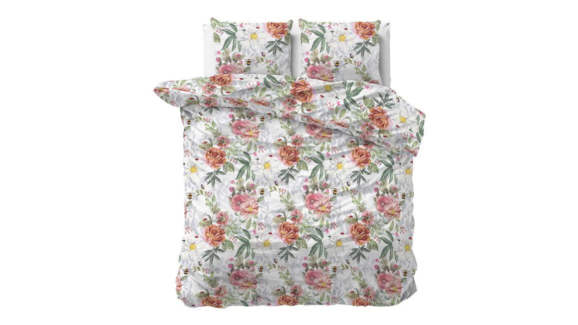 Bloemen zorgen voor een lach op het gezicht. Het dekbedovertrek Romain bestaat uit zachte kleuren en een sprekende print. Mooie bloemen in roze en oranje tinten bieden het romantische sfeertje waar je naar opzoek bent.