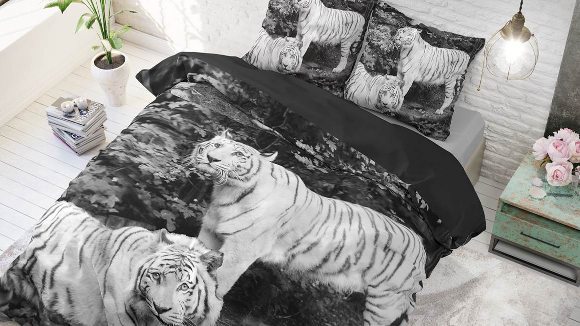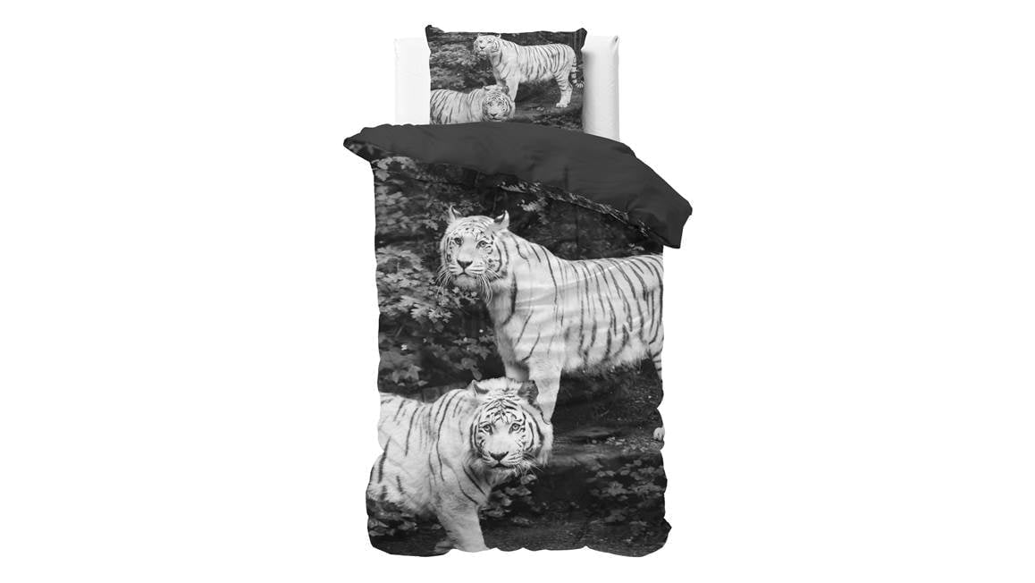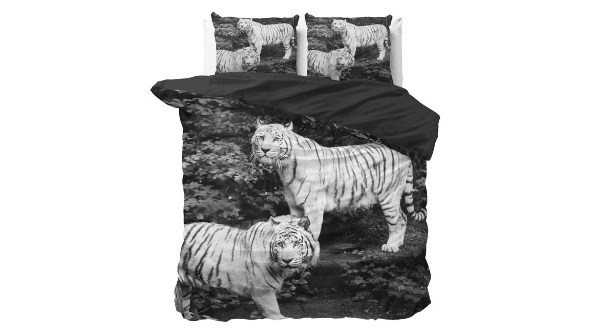 Ben jij een dierenliefhebber? Dan kan het Sleeptime Tigers dekbedovertrek niet missen in jouw slaapkamer. Het overtrek heeft een zwartwit fotoprint van twee prachtige tijgers. De achterkant van het overtrek is effen van kleur.