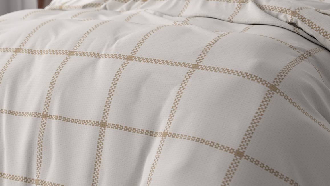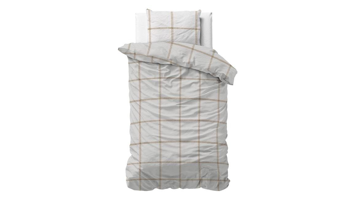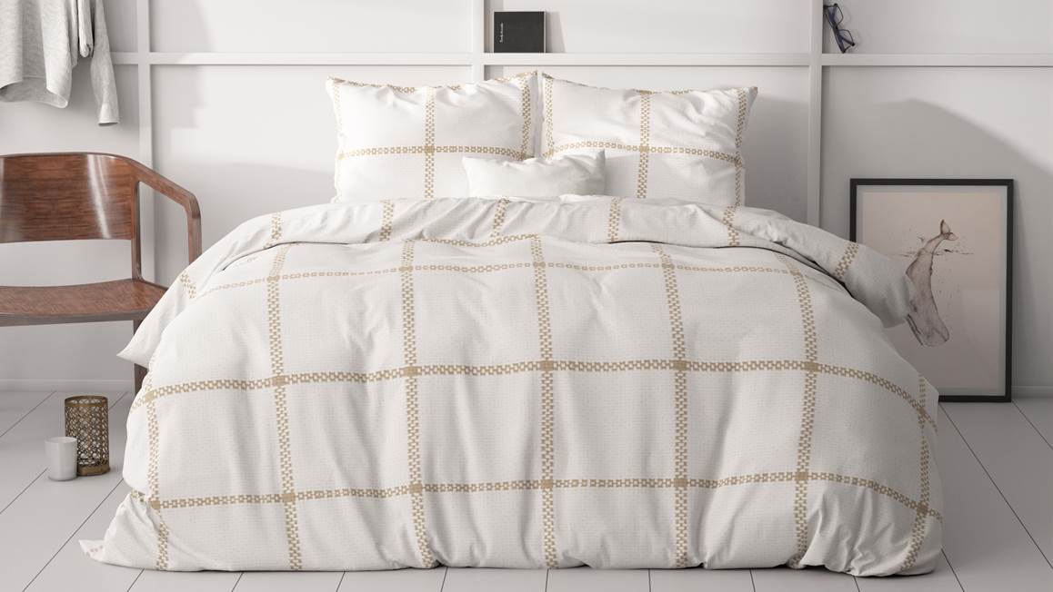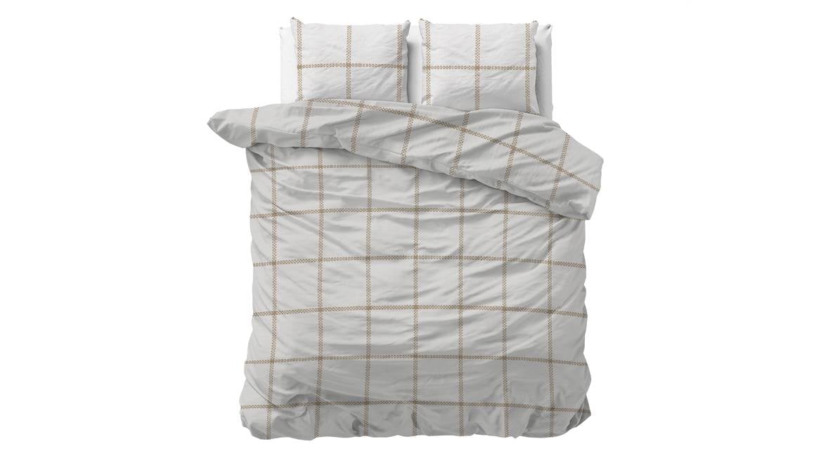 Geef jouw slaapkamer een stijlvolle en rustige uitstraling met het Sleeptime Vasco dekbedovertrek. De grafische print vormt een geruit patroon dat erg sereen oogt. De aardetint komt mooi uit op de witte ondergrond.