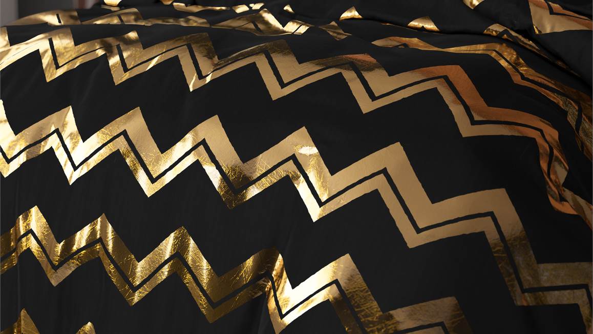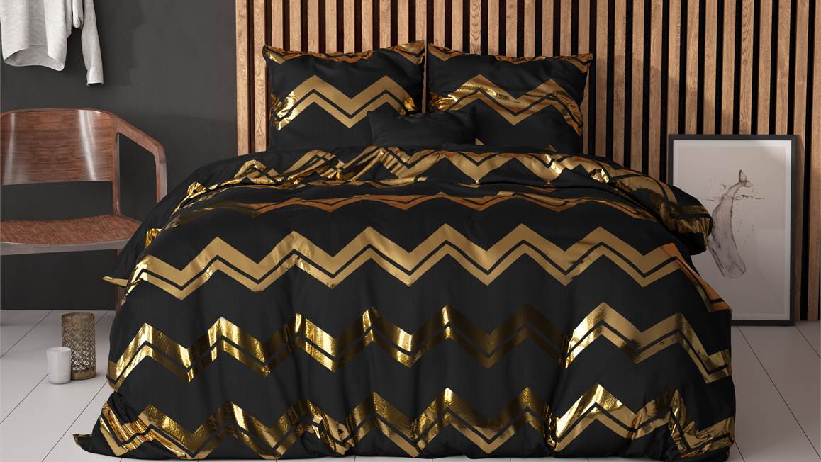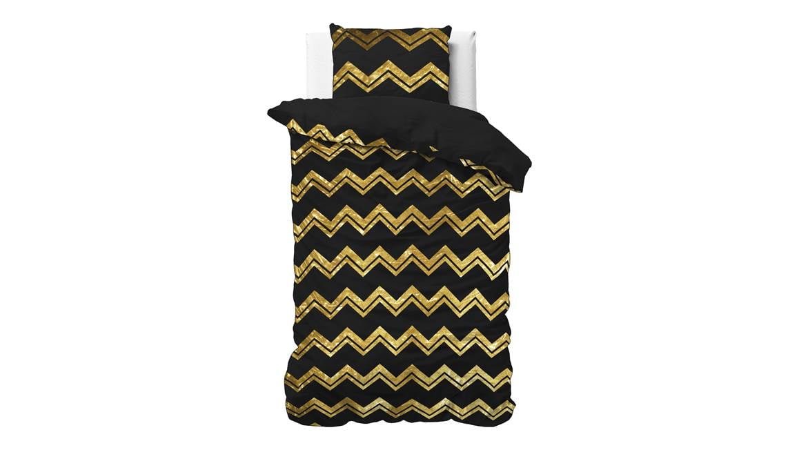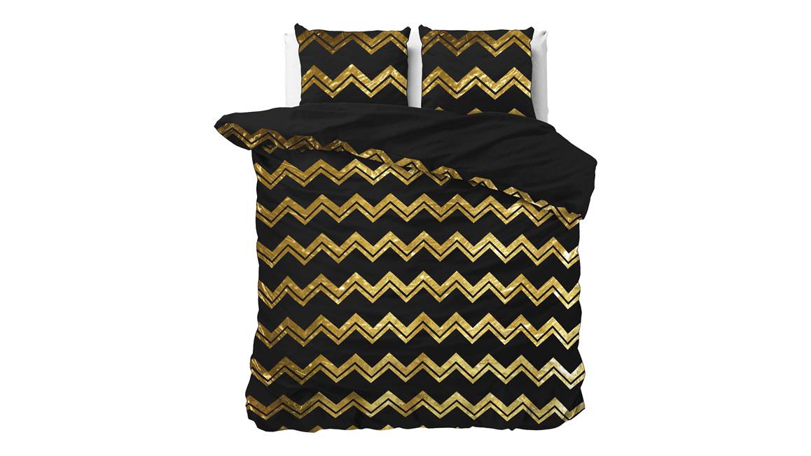 Met dit prachtige Sleeptime Wave dekbedovertrek creëer je een stijlvolle slaapkamerlook. Het zwarte dessin heeft een trendy geometrische print in zwart en goud. Sla je het overtrek een stukje open, dan verschijnt er een zwarte achterzijde.